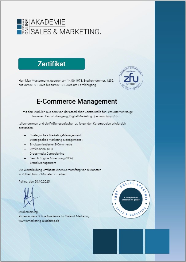 Die E-Commerce-Grundlagen umfassen die Definition und Marktteilnehmer, Chancen und Risiken sowie E-Commerce-Strategien mit Fokus auf Marketing-Mix, Technologien und Aufbau von Onlineshops. Wesentliche Inhalte sind Usability, Payment-Systeme, Shipping und Vermarktungsmöglichkeiten sowohl auf eigenen als auch externen Kanälen. Mobile-Commerce und rechtliche Rahmenbedingungen runden das Thema ab. Das Controlling im E-Commerce mit verschiedenen Tracking-Methoden ist ebenfalls Bestandteil.